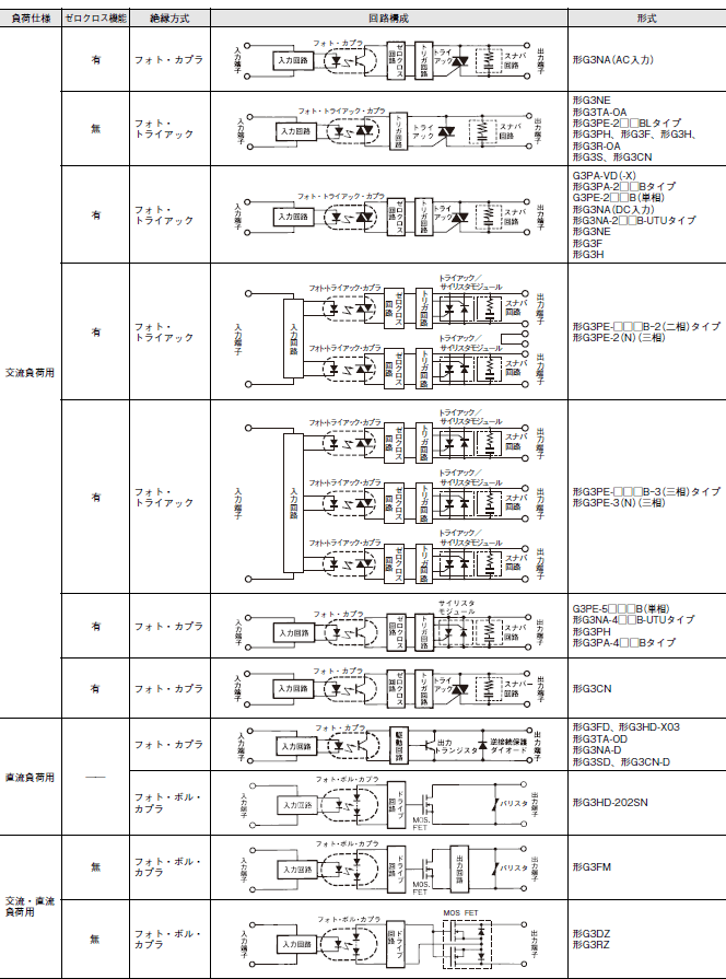 | 負荷電圧 | 形式 | 最大 負荷電流 | 種類 | 備考 | |||||