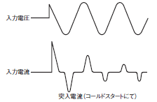 パワーサプライは入力投入時に、入力平滑コンデンサを充電するピーク電流が流れます。この電流を突入電流といいます。突入電流の値は入力投入時のタイミングや突入電流防止回路によって異なりますが、定常状態の入力電流に比較すると、数倍から数十倍の大きさになります。