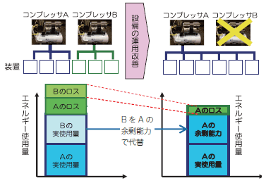 ある生産設備を見てみると、エネルギー使用と生産のタイミングを結びつけ、生産に関係のない「付加価値を生んでいない時間」の消費を「止める」「絞る」でなくします。