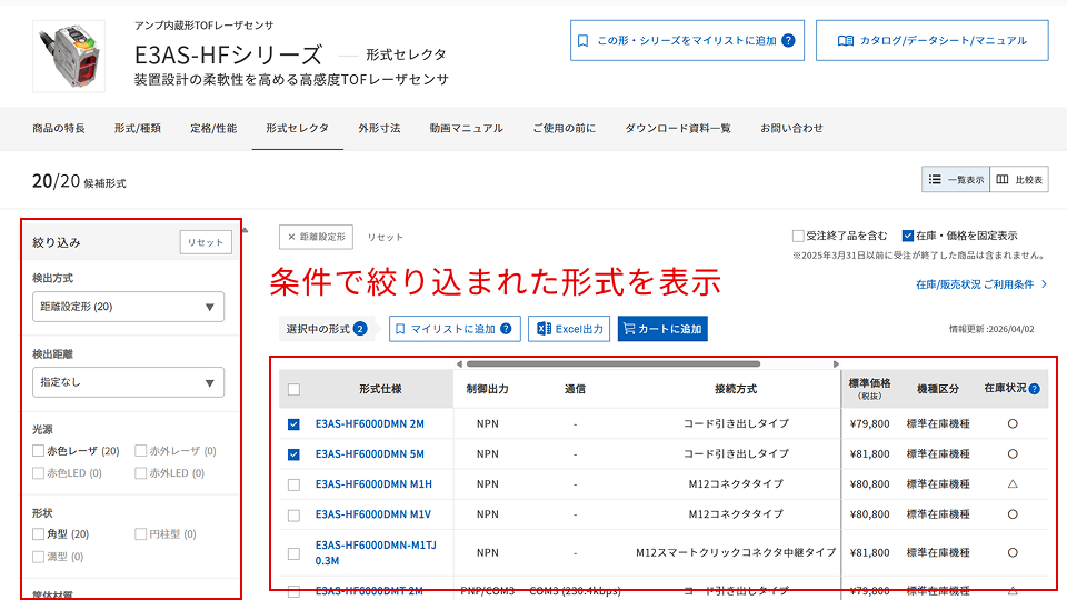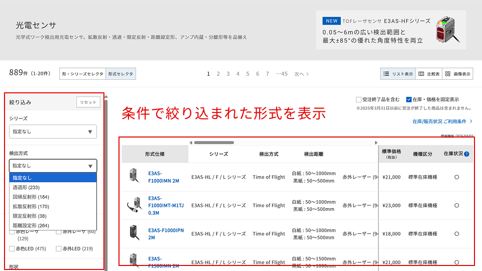 用途・種別・仕様などの条件を選択することで、商品カテゴリ内の形・シリーズや形式を絞り込んで表示できるようになりました。条件に合った商品を一覧で確認でき、価格や在庫情報もあわせて確認ができます。