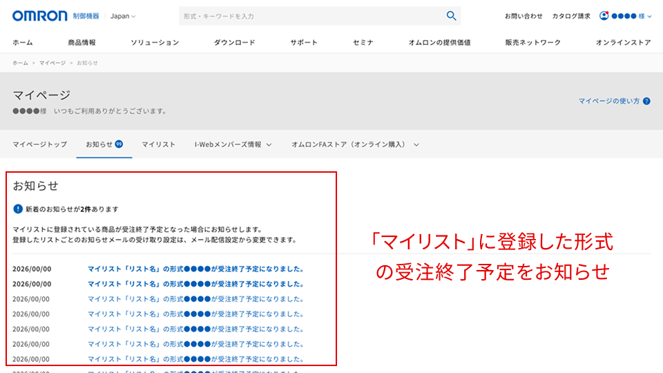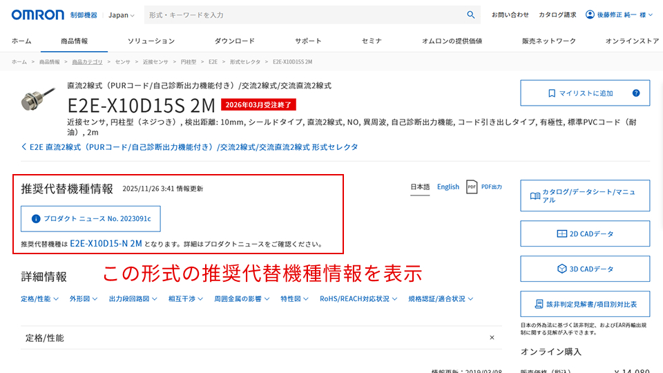 お探しの商品が受注終了、または受注終了予定の場合、該当する形式のページに、受注終了や置き換えについてのご説明を記載したプロダクトニュースや、推奨代替機種へのリンクが表示されます。必要な情報を確認しながら、代替機種の検討をスムーズに行うことができます
