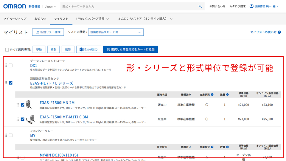 これまで、形・シリーズ単位で管理する「マイカタログ」と、形式単位で管理する「マイパーツ」として提供してきたサービスを統合し、新たに「マイリスト」としてリニューアルしました。 「マイリスト」では、形・シリーズ、形式を区別することなく、必要な商品をひとつのリストで一元管理できます。マイリストに追加した商品は、Excel形式で一覧として出力することも可能です。設計検討時の確認や再購入時のチェック、社内での情報共有がしやすくなり、商品管理にかかる手間を削減できます。商品の登録は、形・シリーズページ、または形式ページから行えます。
