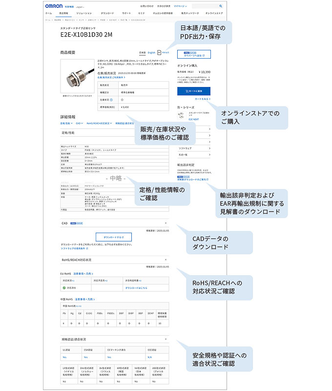 仕様詳細ページでは、仕様の他、輸出該非判定および見解書の取得や、安全規格への認証/適合状況、RoHS/REACHへの対応状況、販売状況・価格・在庫状況の確認等が可能です。