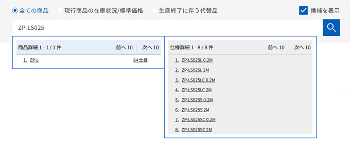 例:検索ワード「ZP-LS025」に対する候補(リンク付き)の表示
