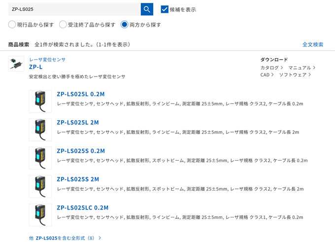 例:検索ワード「ZP-LS025」に対する検索結果の表示