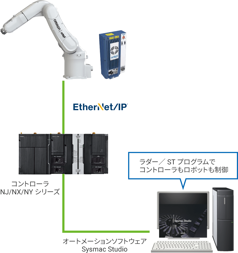 ロボット/コントローラ/周辺機器を簡単に接続し、ロボットをNJ/NXシリーズCPUユニット・産業用PCプラットフォーム NYシリーズ IPCマシンコントローラからダイレクト制御。