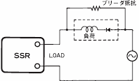 ソレノイド・電磁弁などの誘導負荷を接続される場合は、逆起電力防止ダイオードを接続してください。SSRの出力素子の耐電圧を超えた逆起電力がかかった場合、SSRの出力素子の破壊の原因となります。対策としては、表1の素子を負荷と並列に接続します。(下図参照)