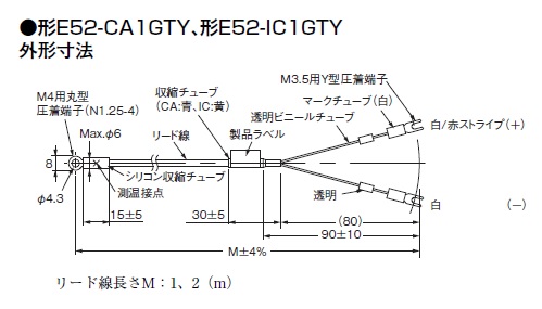 圧着端子付温度センサ, 熱電対 J(IC), リード線直出し形(M3.5用Y形圧着端子), 測温範囲 0~300℃, リード線 2m
