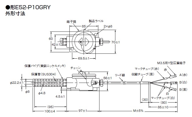 室温用温度センサ, 白金測温抵抗体 Pt100, リード線直出し形(M3.5用Y形圧着端子), 測温範囲 -50~+60℃, リード線 2m