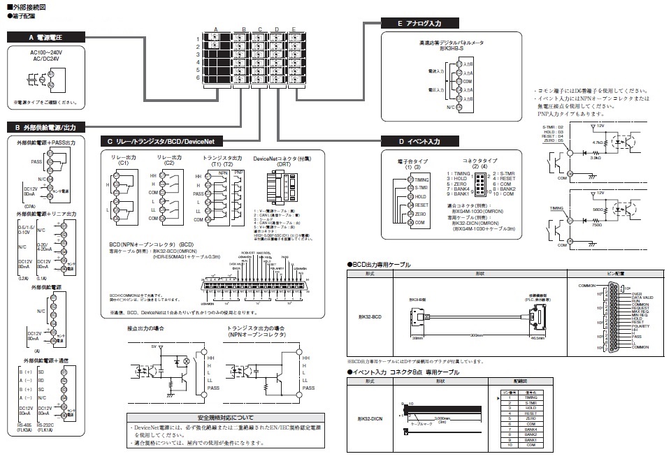 | 無接点 | ON時残留電圧: 2V以下 (タイミング入力は3V以下) 負荷電流: 4mA以下 (タイミング入力は17mA以下) 最大印加電圧: DC30V以下 OFF時漏れ電流: 0.1mA以下 (タイミング入力は1.5mA以下) | |