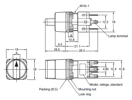 Knob-type Selector Switch (Cylindrical 16-dia.), Non-lighted, Round type, Black, 3 notches, Automatic reset, DPDT, Solder terminal, IP65 oil-resistant type