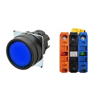 押ボタンスイッチ(φ22), 照光, 樹脂ベゼル, 平形, オルタネイト, ボタンの色: 青, IP66, ねじ端子台, 接点構成: NO/点灯ユニット/NC, LEDランプ色: 青, LEDランプ電圧: AC/DC24V