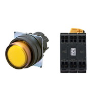 押ボタンスイッチ(φ22), 照光, 樹脂ベゼル, 突出形, オルタネイト, ボタンの色: 黄, IP66, プッシュインPlus端子台, 接点構成: NO/点灯ユニット/NC, LEDランプ色: 黄, LEDランプ電圧: AC100/110/120V
