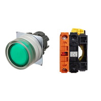 押ボタンスイッチ(φ22), 照光, 金属ベゼル, フルガード形, モーメンタリ, ボタンの色: 緑, IP66, ねじ端子台, 接点構成: -/点灯ユニット/NC, LEDランプ色: 緑, LEDランプ電圧: AC/DC6V