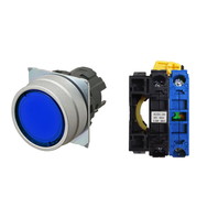 押ボタンスイッチ(φ22), 照光, 金属ベゼル, 平形, オルタネイト, ボタンの色: 青, IP66, ねじ端子台, 接点構成: NO/点灯ユニット/-, LEDランプ色: 青, LEDランプ電圧: AC/DC6V