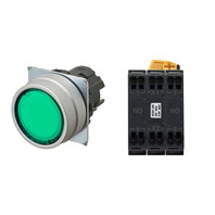 押ボタンスイッチ(φ22), 照光, 金属ベゼル, 平形, オルタネイト, ボタンの色: 緑, IP66, プッシュインPlus端子台, 接点構成: NO/点灯ユニット/NO, LEDランプ色: 緑, LEDランプ電圧: AC/DC12V
