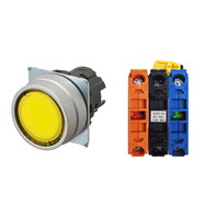 押ボタンスイッチ(φ22), 照光, 金属ベゼル, 平形, モーメンタリ, ボタンの色: 黄, IP66, ねじ端子台, 接点構成: NO/点灯ユニット/NC, LEDランプ色: 黄, LEDランプ電圧: AC100/110/120V