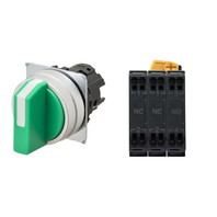 セレクタスイッチ(φ22), 非照光, 3ノッチ, 金属ベゼル, 左に自動復帰, 操作部色: 緑(不透明), IP66, プッシュインPlus端子台, 接点構成: NO/NC/NC