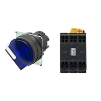 セレクタスイッチ(φ22), 照光, 2ノッチ, 樹脂ベゼル, 手動復帰, 操作部色: 青(透明), IP66, プッシュインPlus端子台, 接点構成: NO/点灯ユニット/NO, LEDランプ色: 青, LEDランプ電圧: AC200/220/230/240V