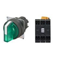 セレクタスイッチ(φ22), 照光, 3ノッチ, 樹脂ベゼル, 左右に自動復帰, 操作部色: 緑(透明), IP66, プッシュインPlus端子台, 接点構成: NC/点灯ユニット/NC, LEDランプ色: 緑, LEDランプ電圧: AC/DC6V
