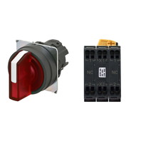 セレクタスイッチ(φ22), 照光, 3ノッチ, 樹脂ベゼル, 左に自動復帰, 操作部色: 赤(透明), IP66, プッシュインPlus端子台, 接点構成: NC/点灯ユニット/NC, LEDランプ色: 赤, LEDランプ電圧: AC/DC6V