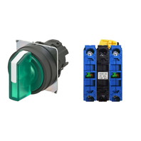 セレクタスイッチ(φ22), 照光, 3ノッチ, 樹脂ベゼル, 手動復帰, 操作部色: 緑(透明), IP66, ねじ端子台, 接点構成: NO/点灯ユニット/NO, LEDランプ色: 緑, LEDランプ電圧: AC100/110/120V
