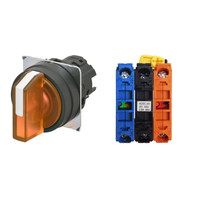 セレクタスイッチ(φ22), 照光, 3ノッチ, 樹脂ベゼル, 右に自動復帰, 操作部色: 橙(透明), IP66, ねじ端子台, 接点構成: NC/点灯ユニット/NO, LEDランプ色: 橙, LEDランプ電圧: AC/DC12V