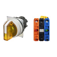 セレクタスイッチ(φ22), 照光, 3ノッチ, 金属ベゼル, 左右に自動復帰, 操作部色: 黄(透明), IP66, ねじ端子台, 接点構成: NO/点灯ユニット/NC, LEDランプ色: 黄, LEDランプ電圧: AC/DC12V
