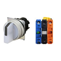 セレクタスイッチ(φ22), 照光, 3ノッチ, 金属ベゼル, 左に自動復帰, 操作部色: 白(透明), IP66, ねじ端子台, 接点構成: NC/点灯ユニット/NO, LEDランプ色: 黄, LEDランプ電圧: AC/DC6V