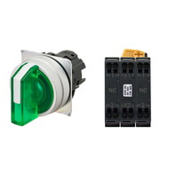セレクタスイッチ(φ22), 照光, 3ノッチ, 金属ベゼル, 手動復帰, 操作部色: 緑(透明), IP66, プッシュインPlus端子台, 接点構成: NC/点灯ユニット/NC, LEDランプ色: 緑, LEDランプ電圧: AC200/220/230/240V