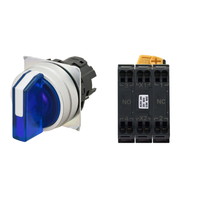 セレクタスイッチ(φ22), 照光, 3ノッチ, 金属ベゼル, 右に自動復帰, 操作部色: 青(透明), IP66, プッシュインPlus端子台, 接点構成: NC/点灯ユニット/NO, LEDランプ色: 青, LEDランプ電圧: AC/DC24V