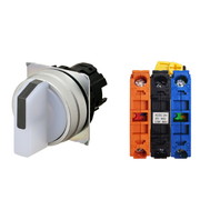 セレクタスイッチ(φ22), 照光, 3ノッチ, 金属ベゼル, 右に自動復帰, 操作部色: 白(透明), IP66, ねじ端子台, 接点構成: NO/点灯ユニット/NC, LEDランプ色: 黄, LEDランプ電圧: AC/DC24V