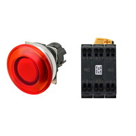 押ボタンスイッチ(φ30), 照光, 金属ベゼル, きのこ形, オルタネイト, ボタンの色: 赤(透明), IP66, プッシュインPlus端子台, 接点構成: NO/点灯ユニット/NC, LEDランプ色: 赤, LEDランプ電圧: AC100/110/120V