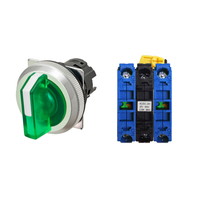 セレクタスイッチ(φ30), 照光, 3ノッチ, 金属ベゼル, 左に自動復帰, 操作部色: 緑(透明), IP66, ねじ端子台, 接点構成: NO/点灯ユニット/NO, LEDランプ色: 緑, LEDランプ電圧: AC/DC6V