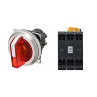 セレクタスイッチ(φ30), 照光, 3ノッチ, 金属ベゼル, 右に自動復帰, 操作部色: 赤(透明), IP66, プッシュインPlus端子台, 接点構成: NO/点灯ユニット/NO, LEDランプ色: 赤, LEDランプ電圧: AC200/220/230/240V