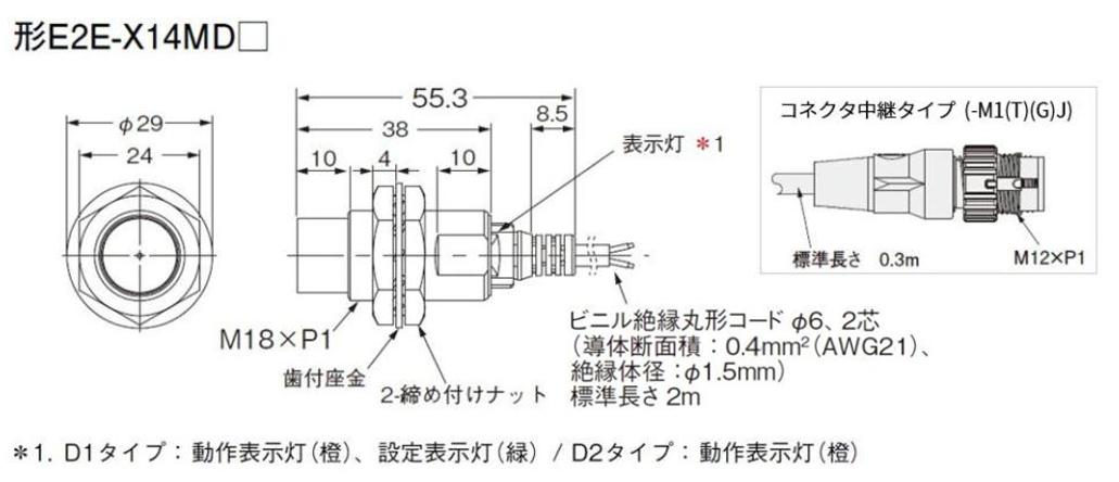 | 材質 | ケース: 黄銅 ニッケルメッキ 検出面: ポリブチレンテレフタレート (PBT) 締めつけナット: 黄銅 ニッケルメッキ 歯付座金: 鉄 亜鉛メッキ コード: 塩化ビニル (PVC) |
