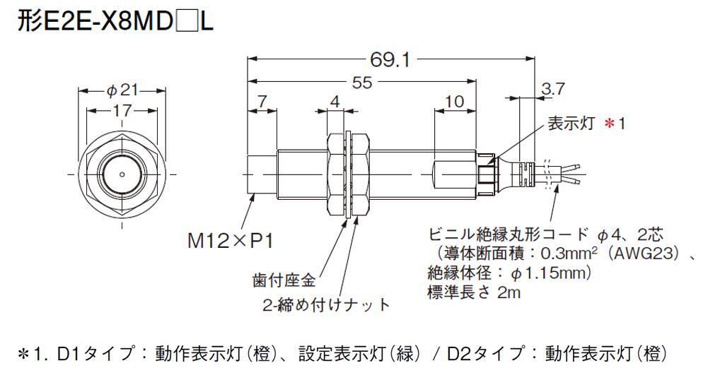 近接センサ, 直流2線式, 検出距離 8mm, 非シールドタイプ, NO, 異周波, ロングボディ, M12, コード引き出しタイプ, 有極性, 標準PVCコード, 2m