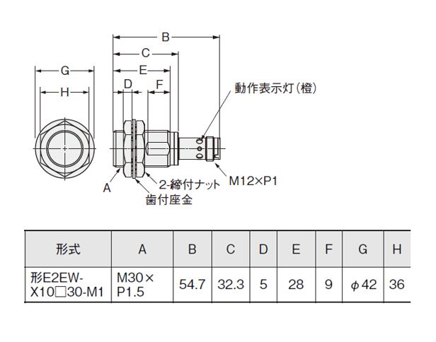 | 材質 | ケース: ステンレス (SUS303) 検出面: ステンレス (SUS303) 締めつけナット: ステンレス (SUS303) 歯付座金: 鉄 亜鉛メッキ |