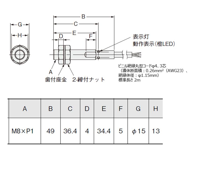 | 材質 | ケース: ステンレス (SUS303) 検出面: ステンレス (SUS303) 締めつけナット: ステンレス (SUS303) 歯付座金: 鉄 亜鉛メッキ コード: 塩化ビニル (PVC) |