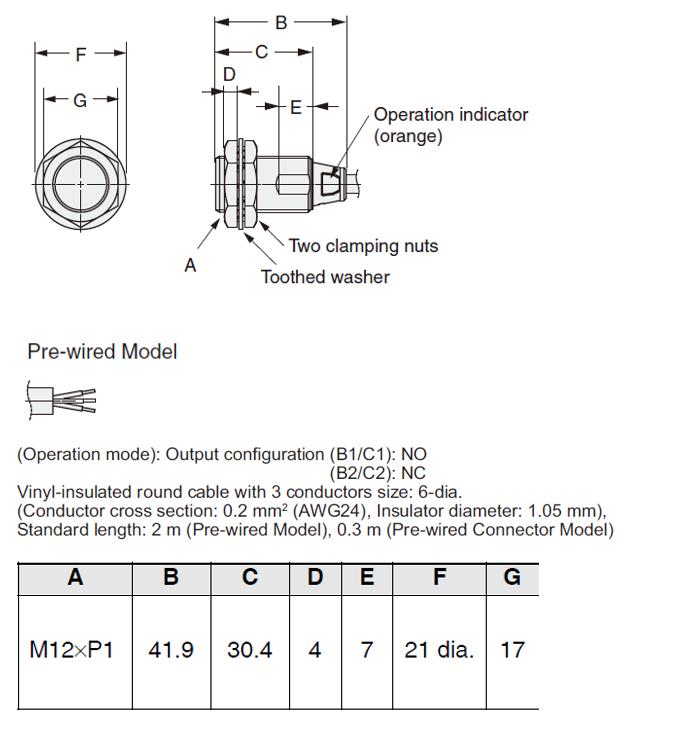 | Material | Case: Stainless steel (SUS303) Sensing surface: Stainless steel (SUS303) Clamping nuts: Stainless steel (SUS303) Toothed washers: Iron zinc plating Cable: PVC |