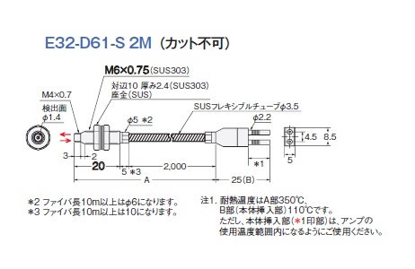 ファイバセンサ, 耐熱(350℃), 反射形, M6ねじ型, トップビュー, ケーブル長 2m, R25