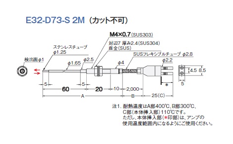 ファイバセンサ, 耐熱(400℃), 反射形, M4ねじ型(スリーブ付き), トップビュー, ケーブル長 2m, R25