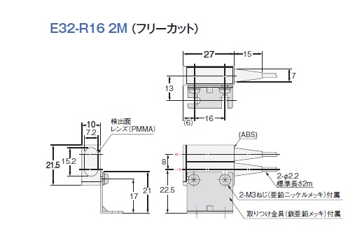 ファイバセンサ, 回帰反射形, 角型, トップビュー, ケーブル長 2m, R25