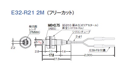 ファイバセンサ, 回帰反射形, M6ねじ型, トップビュー, ケーブル長 2m, R10
