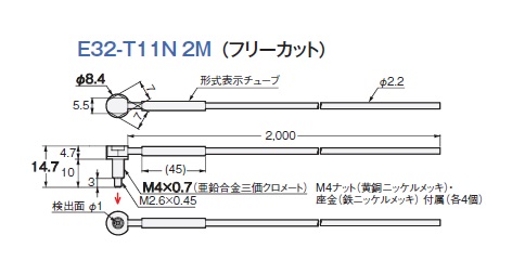 ファイバセンサ, 透過形, M4ねじ型, ライトアングル, 開口角 約60°, 光軸径 φ1, ケーブル長 2m, 折れにくい, R1
