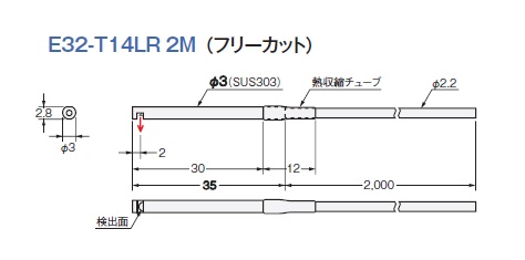 ファイバセンサ, 透過形, φ3 円柱型, サイドビュー, 光軸径 φ1, ケーブル長 2m, 折れにくい, R1