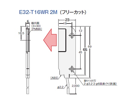 ファイバセンサ, エリア, 透過形, サイドビュー, ケーブル長 2m, 折れにくい, R1
