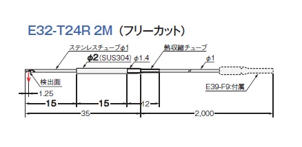 ファイバセンサ, 透過形, φ2 円柱型(スリーブ付き), サイドビュー, 光軸径 φ0.5, ケーブル長 2m, 折れにくい, R1
