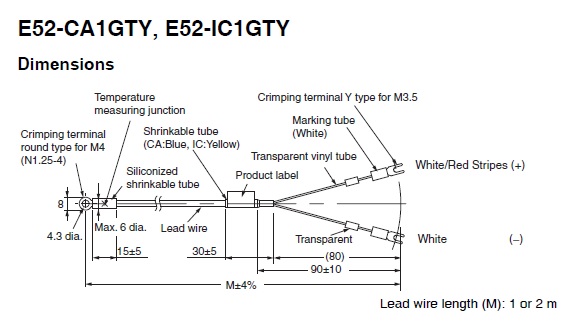 Crimping terminals Temperature Sensor, Thermocouple J (IC), Exposed lead wires (Crimping terminal Y type for M3.5), Temperature range: 0 to 300 ℃, Lead wire: 2 m
