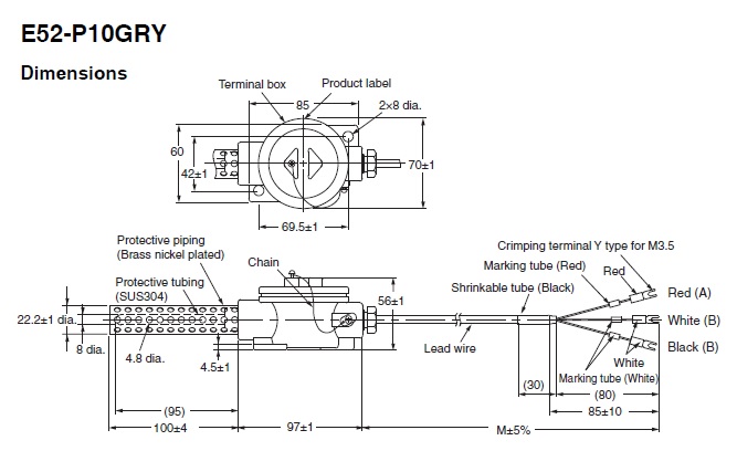 Used for room temperature measurement Temperature Sensor, Platinum resistance thermometer Pt100, Exposed-lead model (Crimping terminal Y type for M3.5), Temperature range: -50 to +60 ℃, Lead wire: 2 m